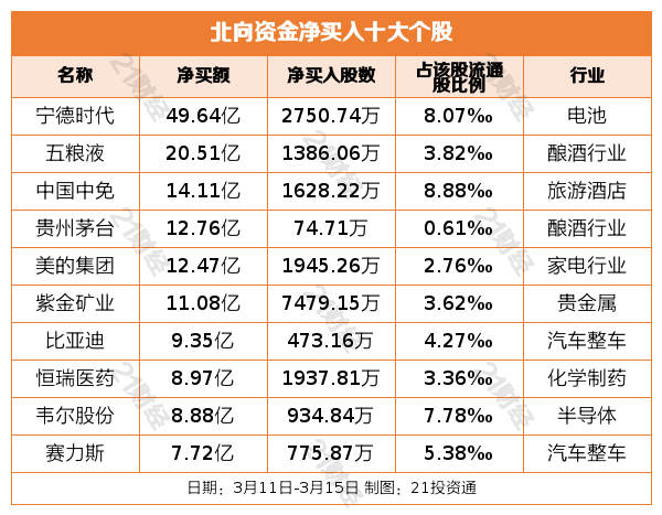 个股方面,北向资金净买入宁德时代(300750.SZ)、五粮液(000858.SZ)、中国中免(601888.SH)、贵州茅台(600519.SH)、美的集团(000333.SZ)居前,其中,宁德时代被净买入49.64亿元,五粮液被净买入20.51亿元,中国中免被净买入14.11亿元,贵州茅台被净买入12.76亿元,美的集团被净买入12.47亿元。