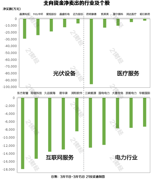 北向资金减持了19个行业,其中光伏设备最多,净卖出金额达14.23亿元,其次是医疗服务行业,净卖出10.87亿元。