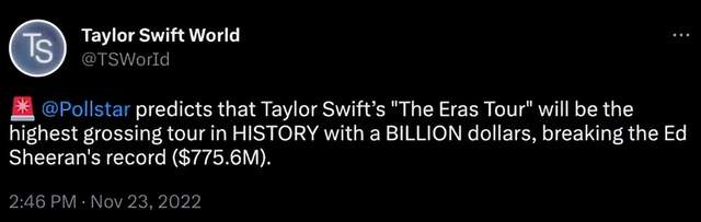 巡演57场后,霉霉的净资产由巡演开始前的7.4亿美元增加到11亿美元,成为史上票房收入最高的巡回演唱会,以及史上第一个总票房超过10亿美元的巡回演唱会,超过艾尔顿·约翰的告别巡回演唱会。