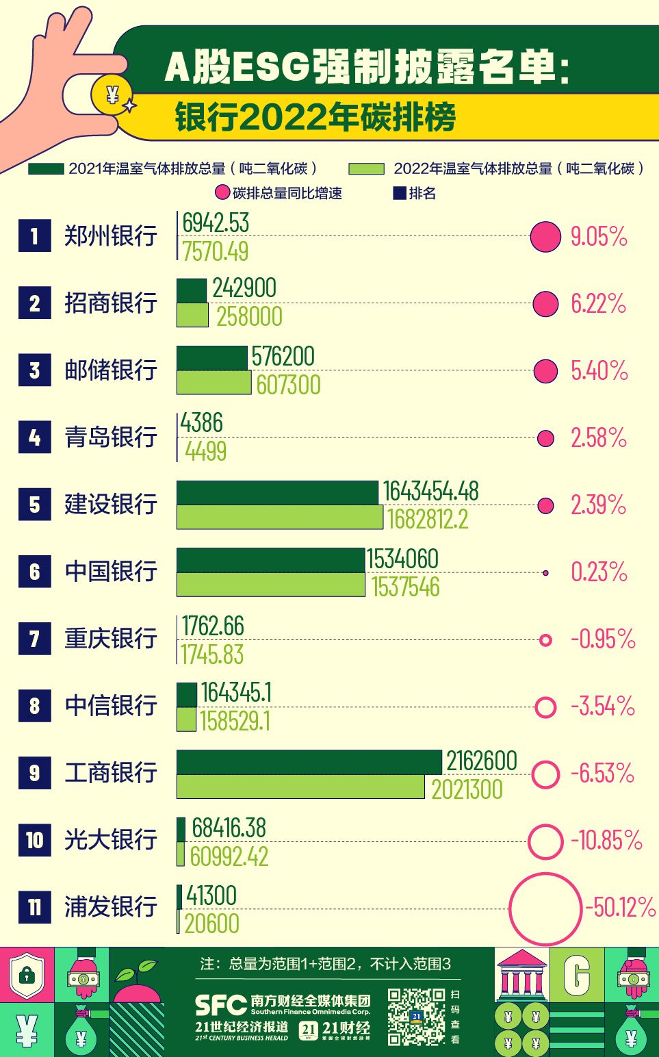 为了对比21家银行的温室气体减排情况,课题组全盘梳理了其2021年、2022年温室气体排放总量,并依据其碳排总量同比增速进行排名,同步梳理其绿色金融等环境披露信息,一窥银行碳减排信息披露现状。
