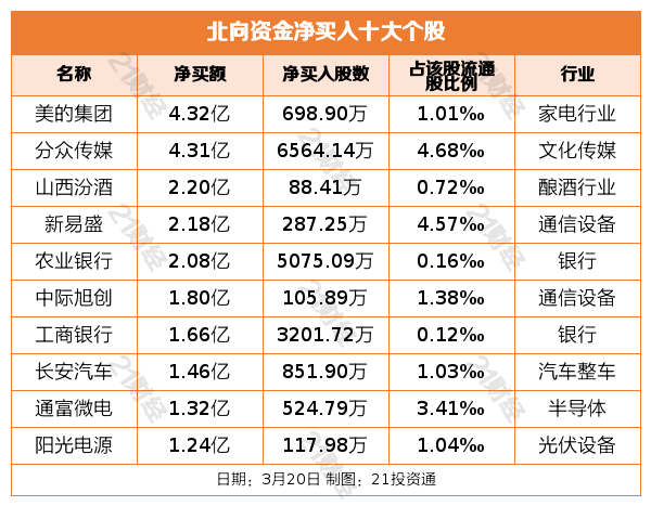 个股方面,北向资金净买入美的集团(000333.SZ)、分众传媒(002027.SZ)、山西汾酒(600809.SH)、新易盛(300502.SZ)、农业银行(601288.SH)居前,其中,美的集团被净买入4.32亿元,分众传媒被净买入4.31亿元,山西汾酒被净买入2.20亿元,新易盛被净买入2.18亿元,农业银行被净买入2.08亿元。
