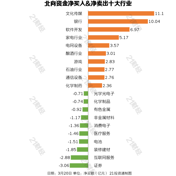 从净买入金额来看,北向资金增持了71个行业,其中文化传媒居首,净买入金额达11.10亿元,其次是银行行业,净买入10.04亿元。