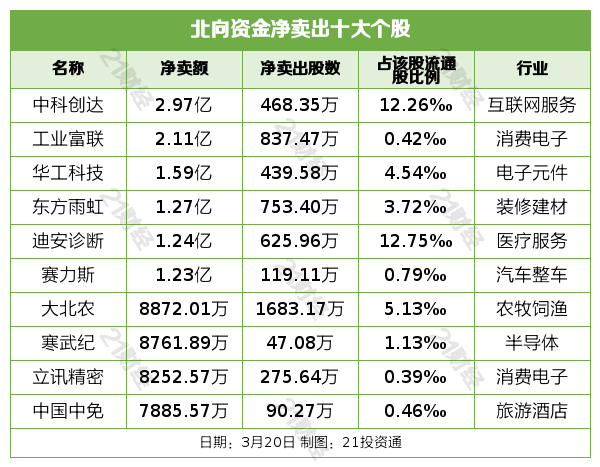 北向资金净卖出中科创达(300496.SZ)、工业富联(601138.SH)、华工科技(000988.SZ)、东方雨虹(002271.SZ)、迪安诊断(300244.SZ)居前,其中,中科创达被净卖出2.97亿元,工业富联被净卖出2.11亿元,华工科技被净卖出1.59亿元,东方雨虹被净卖出1.27亿元,迪安诊断被净卖出1.24亿元。