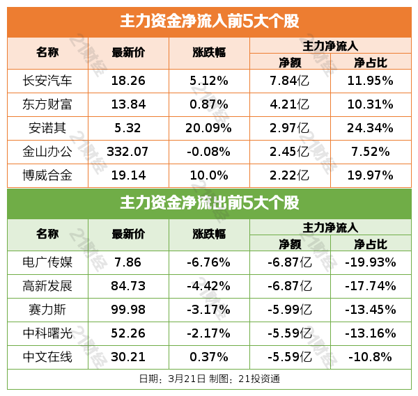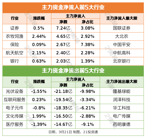 3月21日,A股三大指数集体下跌,截至收盘,沪指跌0.08%,深成指跌0.36%,创业板指跌0.64%,北证50指数跌1.16%,沪深京三市成交额10741亿元,其中沪深两市10678亿元,北交所63亿元。两市超2900只个股下跌,北向资金净卖出60.2亿元。板块题材上,低空经济、猪肉、贵金属、游戏传媒、景点旅游板块涨幅居前;汽车拆解、CRO、AI手机、光刻胶概念跌幅居前。盘面上,受国际金价大涨影响,贵金属板块上涨。低空经济概念股午后持续走强。猪肉板块午后涨幅持续扩大。游戏传媒、教育、景点旅游等板块亦有不俗表现。AI手机概念股回调,福蓉科技跌超7%。CRO、创新药概念股继续低迷。