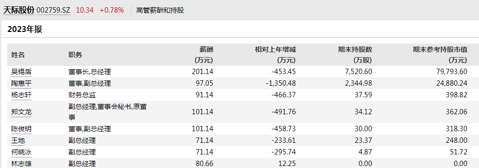 其中,天际股份副总经理陶惠平降幅最为明显,由2022年的1448万元降至97万元,另有4人年度薪酬减少超过400万元。