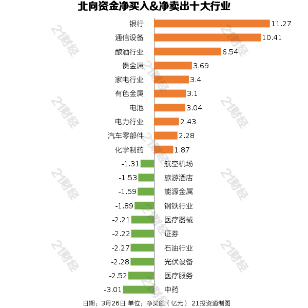 从净买入金额来看,北向资金增持了67个行业,其中银行居首,净买入金额达11.27亿元,其次是通信设备行业,净买入10.41亿元。
