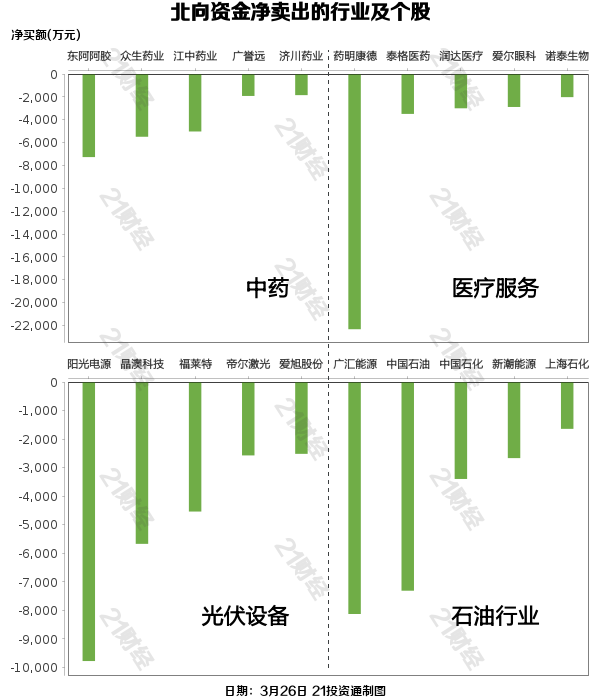 北向资金减持了33个行业,其中中药最多,净卖出金额达3.01亿元,其次是医疗服务行业,净卖出2.52亿元。