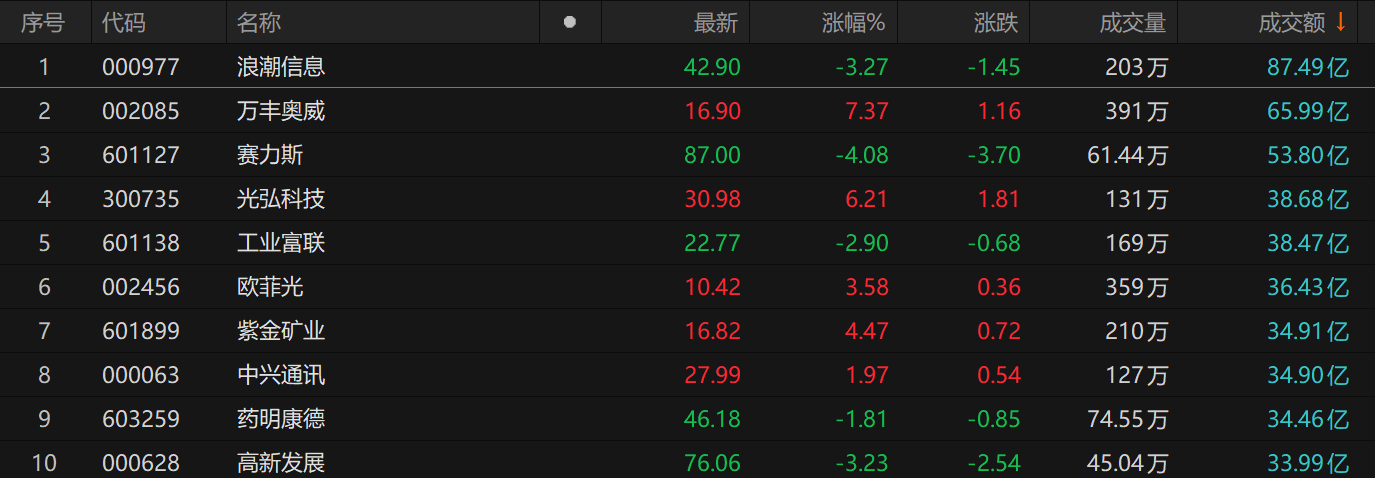 个股方面,浪潮信息87.49亿元成交额居首,万丰奥威、赛力斯等成交额居前。
