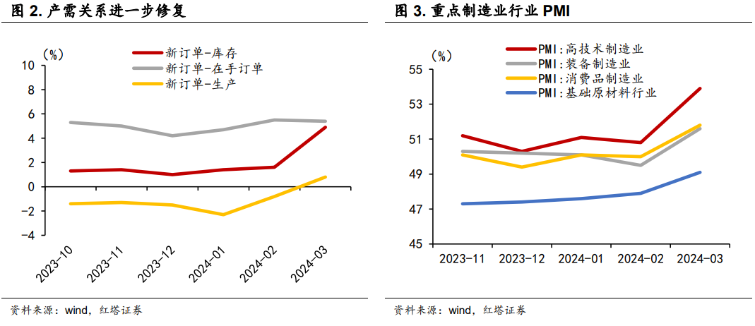 供需关系也得到进一步修复。从绝对值水平看,新订单指数高于生产指数0.8个百分点;从回升幅度看,新订单和新出口订单指数的环比上行幅度均高于生产指数。