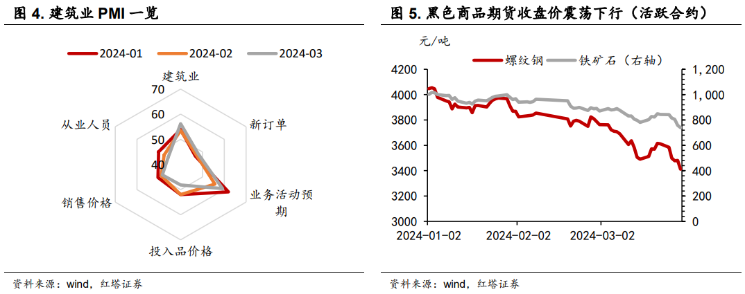 我们认为与化债期间地方政府基建投资偏谨慎,同时地产销售、施工数据依旧处在低位有关。其他数据也能对此进行印证,比如上游黑色金属冶炼及压延加工制造业PMI指数低于临界点,再比如年初以来黑色商品价格震荡下滑。