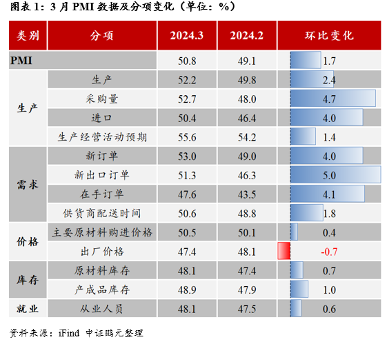 3月制造业采购经理指数PMI为50.8%,比上月上升1.7个百分点,自去年9月以来重返扩张区间。根据近年春节在二月的历史数据,6年环比增速均值为1.0个百分点,故3月PMI指数回升符合季节性规律,但回升幅度明显超季节性水平,进一步验证经济持续修复。具体看,生产指数和新订单指数分别为52.2%和53%,分别较上月上升2.4和4.0个百分点;出口指数大幅回升,出厂价格指数下降,小型企业PMI指数连续12个月首次进入扩张区间,服务业维持扩张,建筑业略低于季节性水平。