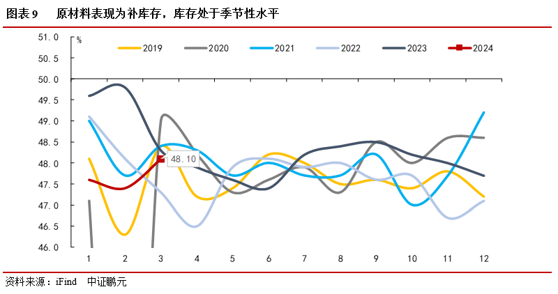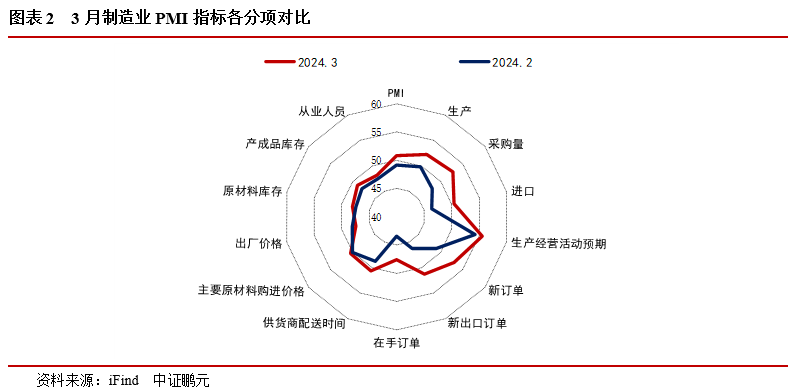 供需方面:供需两端景气度均有改善,指数回升至枯荣线上。生产指数和新订单指数分别为52.2%和53%,分别较上月上升2.4和4个百分点,采购量指数上升4.7个百分点至52.7%。节后气温回升,企业加速复工复产。在生产和市场需求回升的带动下,制造业企业采购活动也明显增加。3月份,市场供需两端协同增长,需求端改善强于生产端,不分行业过剩现象或有改善,经济基本面逐步修复。