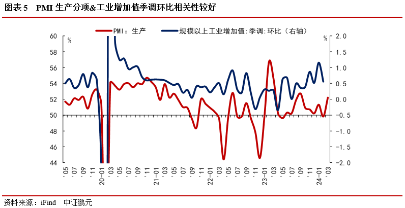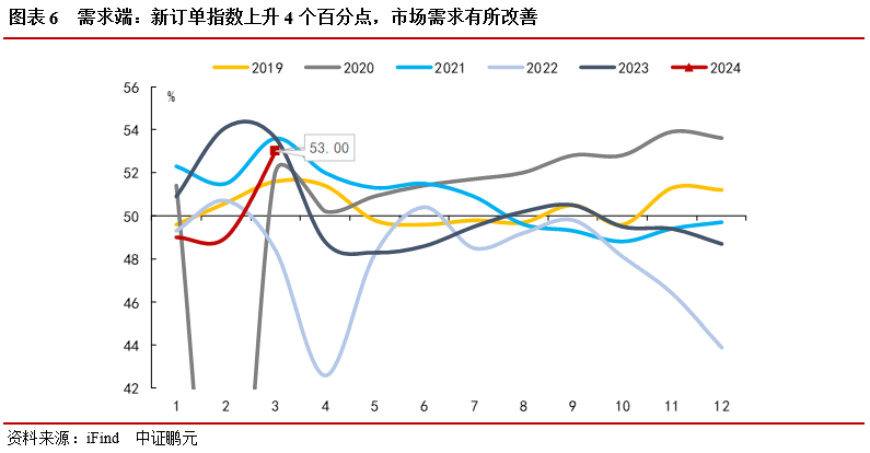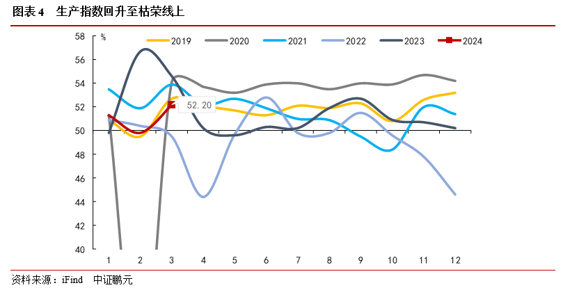 2024年3月,制造业采购经理指数为 50.8%,比上月上升1.7个百分点,自2023年9月以来重返扩张区间。根据历史数据,2013年到2023年共有7年的农历春节在二月,其中2015、2016和2019三年的3月PMI由枯荣线下回调至枯荣线上,其余3年(剔除2022年)景气程度也实现进一步攀升,6年环比增速均值达到1.0%。故3月PMI指数回升符合季节性规律,但回升幅度明显超季节性水平,进一步验证经济持续修复。主要原因是春节后多数企业加快复工复产,市场活跃度提升,在调查的21个行业中有15个位于扩张区间,比上月增加10个,制造业景气程度改善明显。