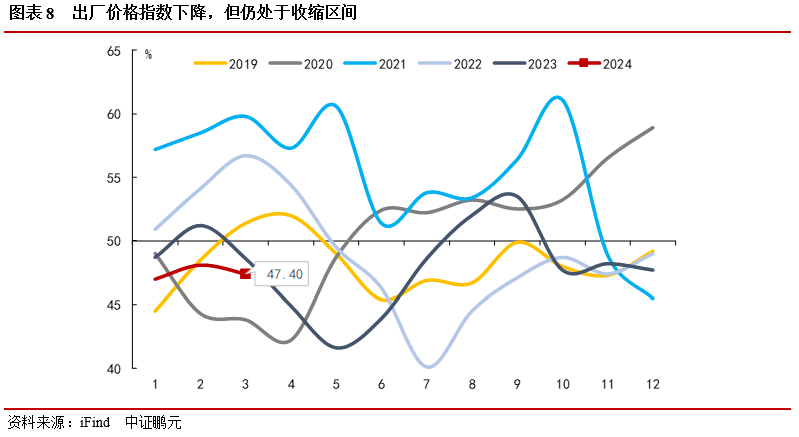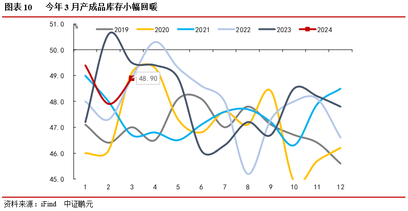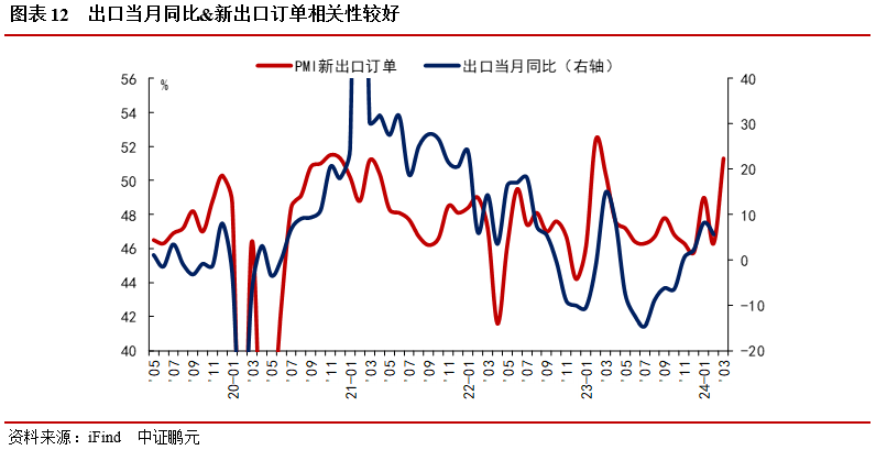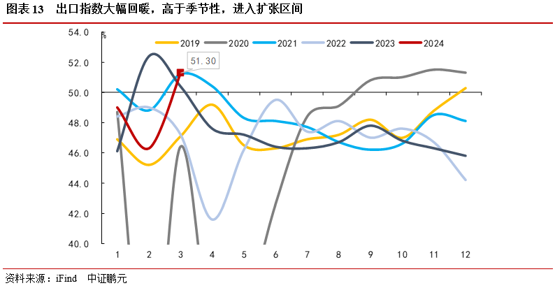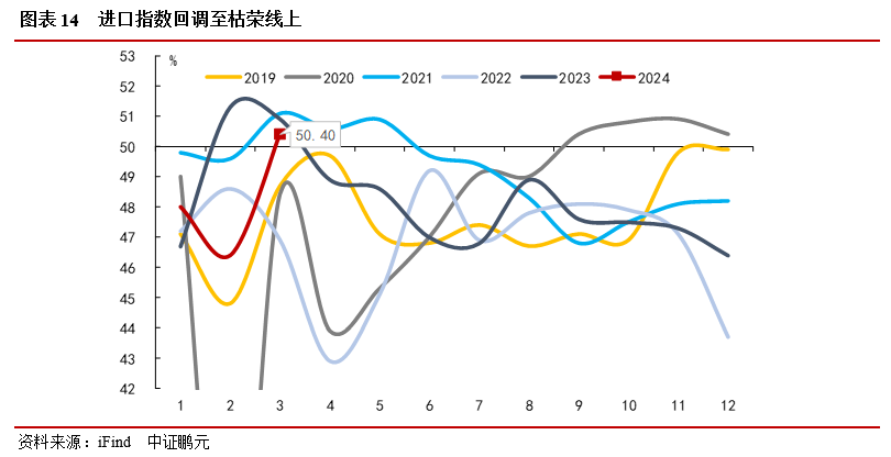 进出口方面:出口指数大幅好于季节性。新出口订单指数为51.3%,比上月上升5个百分点。进口指数为50.4%,比上月上升4个百分点。新出口订单指数和进口指数均上升至枯荣线之上,国内外需求呈现季节性回暖态势。从行业看,化学纤维及橡胶塑料制品、汽车、计算机通信电子设备等行业两个指数均高于临界点,相关行业外贸业务较上月增加。新出口订单指数与出口同比增速有一定相关性,3月出口数据偏乐观。
