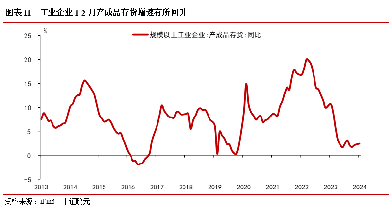 库存方面:原材料和产成品库存指数均小幅回暖。原材料库存指数为48.1%,比上月上升0.7个百分点。产成品库存指数为48.9%,比上月上升1个百分点。原材料价格上升,库存上升;产成品出厂价格下降,库存上升,需求有所改善。最新1-2月工业企业产成品存货同比2.4%,较前值上升0.3个百分点,库存水平有补库态势。