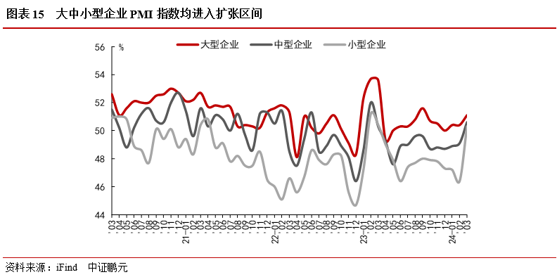 分企业类型:小型企业PMI指数连续12个月首次进入扩张区间,大幅改善。大、中、小型企业PMI分别为51.1%、50.6%和50.3%,比上月上升0.7、1.5和3.9个百分点,不同规模企业生产经营状况均有所改善。其中,大型企业PMI连续11个月在枯荣线以上,发挥引领带头作用;中小型企业PMI指数连续12个月首次进入扩张区间,生产经营活动有所加快。此外,3月贡献明显偏高的是小企业PMI。一般情况,小型企业是民企主导,出口和服务需求拉动。开年以来出口数据表现十分亮眼,外需回暖带动小型企业景气度明显攀升。