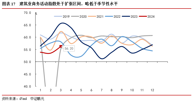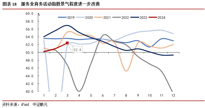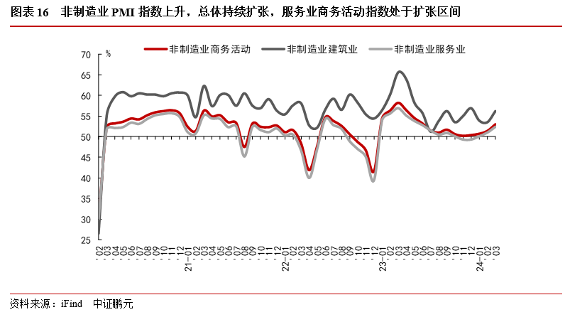 非制造业PMI:处于扩张区间,建筑业略低于季节性水平、服务业呈现扩张态势。3月份,非制造业商务活动指数为53.0%,比上月上升1.6个百分点,非制造业景气水平持续回升。建筑业商务活动指数为56.2%,比上月上升2.7个百分点。随着气候转暖和节后集中开工,各地建筑工程施工进度加快,建筑业总体扩张增速,但略低于季节性水平,这跟今年基建进度偏慢对应。服务业商务活动指数为52.4%,比上月上升1.4个百分点,连续三个月回升,服务业扩张步伐加快。从行业看,货币金融服务等行业商务活动指数位于60.0%以上高位景气区间,业务总量增长较快;批发、铁路运输、租赁及商务服务等行业商务活动指数位于53.0%及以上,景气水平不同程度回升。