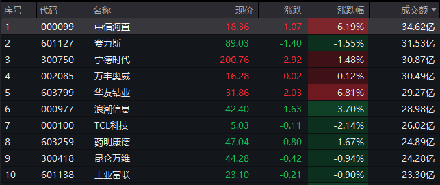 沪深两市半日成交额6023亿,较上个交易日同期缩量501亿。个股方面,中信海直成交额34.62亿元居首,赛力斯、宁德时代、万丰奥威成交额均超30亿元。