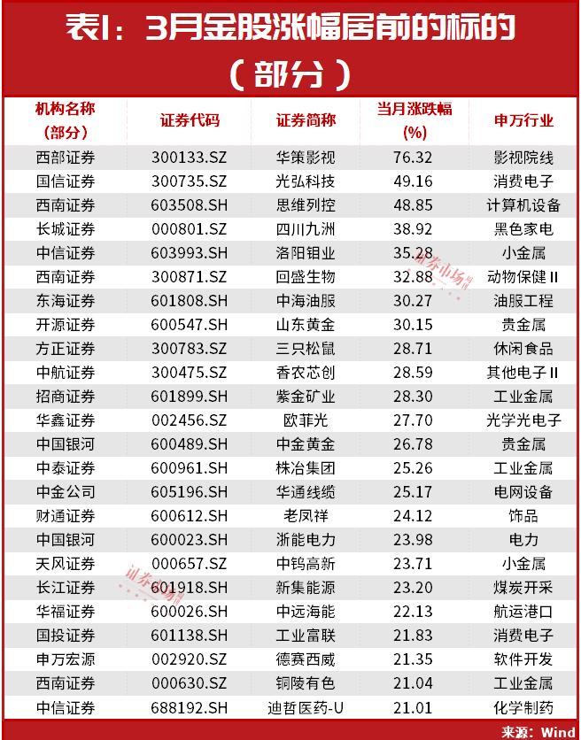 另外,从券商3月推荐的500只金股来看,有近300只实现了上涨,涨幅居前的标的除了上文提及的华策影视、洛阳钼业等,还包括光弘科技、思维列控、四川九洲、回盛生物、中海油服、山东黄金、三只松鼠等(见表1)。