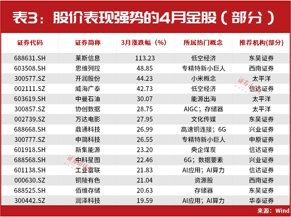 回顾3月,券商关注的多行业龙头实现了显著领涨,它们分布于AI、小米汽车、低空经济、有色金属等热门领域。那么,4月哪些机会值得重点关注?