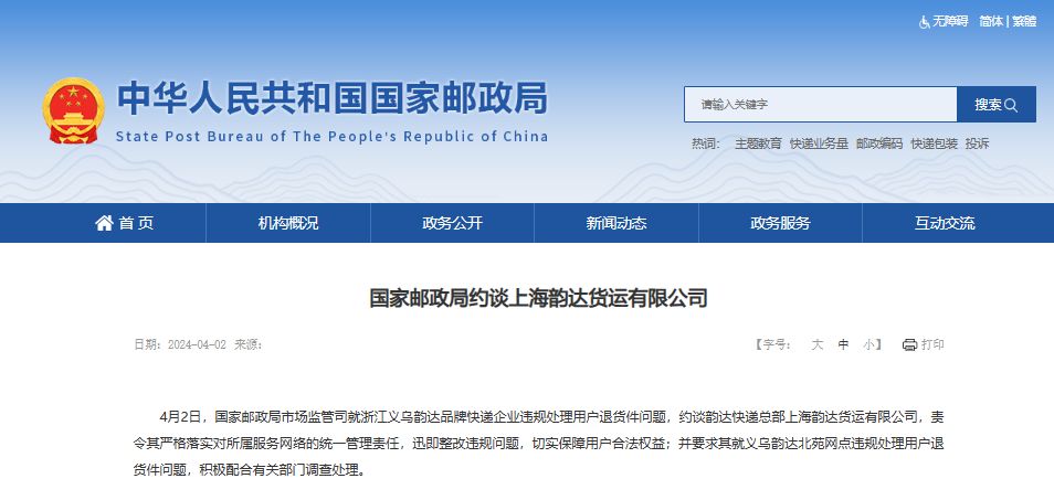4月2日,国家邮政局市场监管司就浙江义乌韵达品牌快递企业违规处理用户退货件问题,约谈韵达快递总部上海韵达货运有限公司,责令其严格落实对所属服务网络的统一管理责任,迅即整改违规问题,切实保障用户合法权益;并要求其就义乌韵达北苑网点违规处理用户退货件问题,积极配合有关部门调查处理。