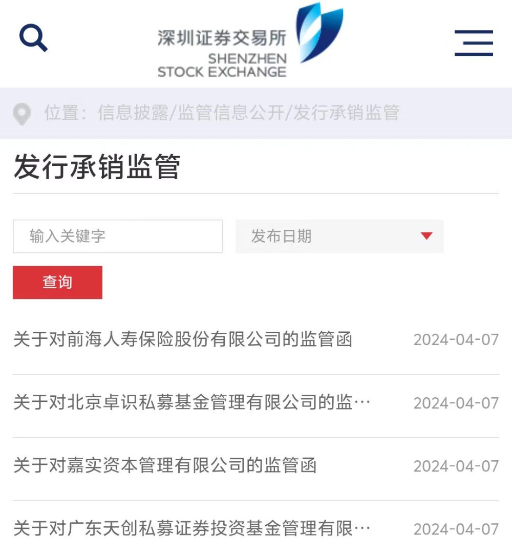 4月7日,南财快讯记者从深交所官网获悉,深交所对嘉实资本管理有限公司、前海人寿保险股份有限公司、北京卓识私募基金管理有限公司、对广东天创私募证券投资基金管理有限公司发布监管函,指出4家机构在新股申购中不同程度存在内控制度制定和执行不完备,估值研究不深入、定价依据不充分,报价集体决策机制不完善等问题,对4家新股报价机构采取书面警示措施,明确要求限期提交整改报告。