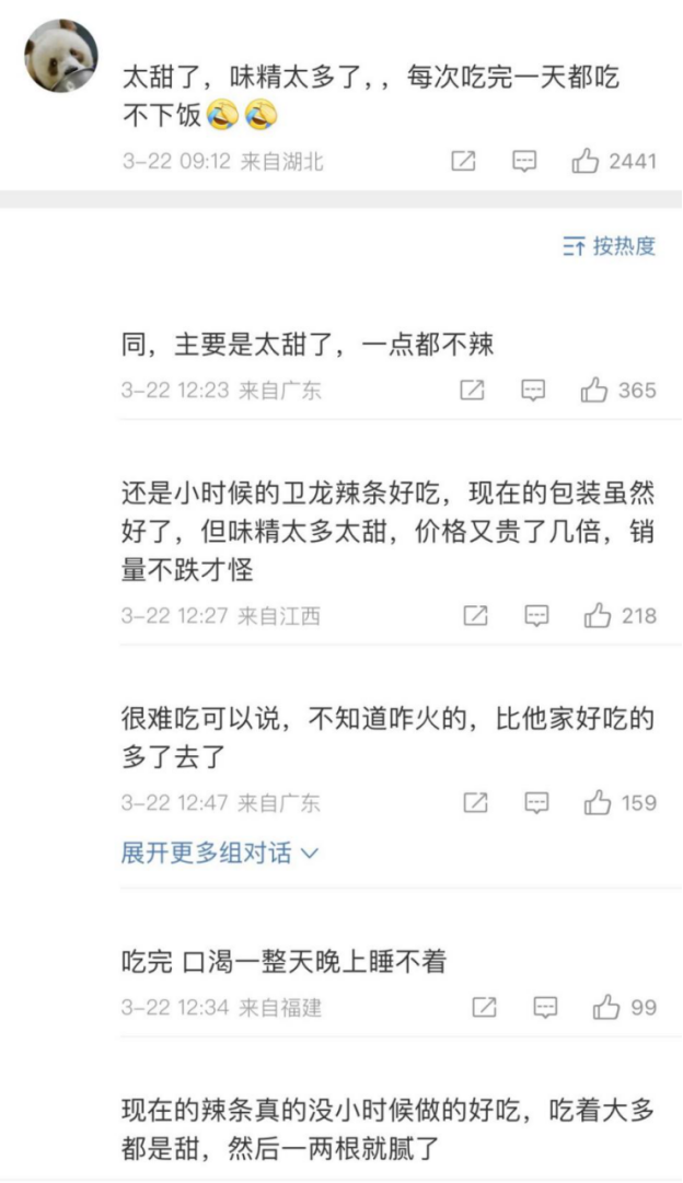不仅如此,卫龙辣条口味偏甜,也被诸多网友认为是其不受青睐的重要原因,更有网友吐槽道“卫龙你家那个糖是不是不要钱,使劲放,别叫辣条了,叫甜条吧!”