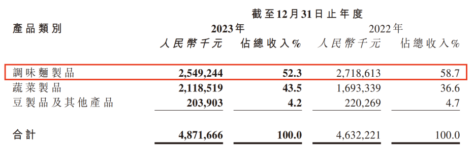 2023年,卫龙调味面制品的产能利用率甚至连一半都不到,仅为48.3%;调味面制品收入也由2022年的27.19亿元减少至2023年的25.49亿元,下降6.25%,收入占比由2022年的58.7%下降至2023年的52.3%。