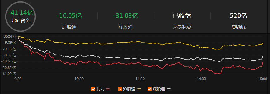 北向资金全天净卖出41.14亿,其中沪股通净卖出10.05亿元,深股通净卖出31.09亿元。