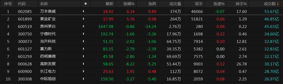 沪深两市今日成交额8300亿,较上个交易日放量337亿。个股方面,万丰奥威成交额53.67亿元居首,紫金矿业、贵州茅台、宁德时代等成交额靠前。