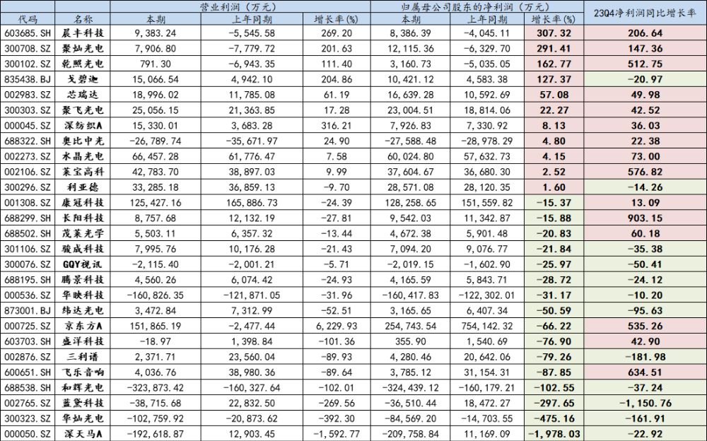 不过,部分企业的2023年报和2024年一季报也显示,2023Q4以来,A股面板厂商的营收状况在不断好转。例如,去年板块净利润总量靠前的京东方、康冠科技、水晶光电、莱宝高科在2023年Q4归母净利润分别同比增长535%/13.09%/72.99%/576.82%。
