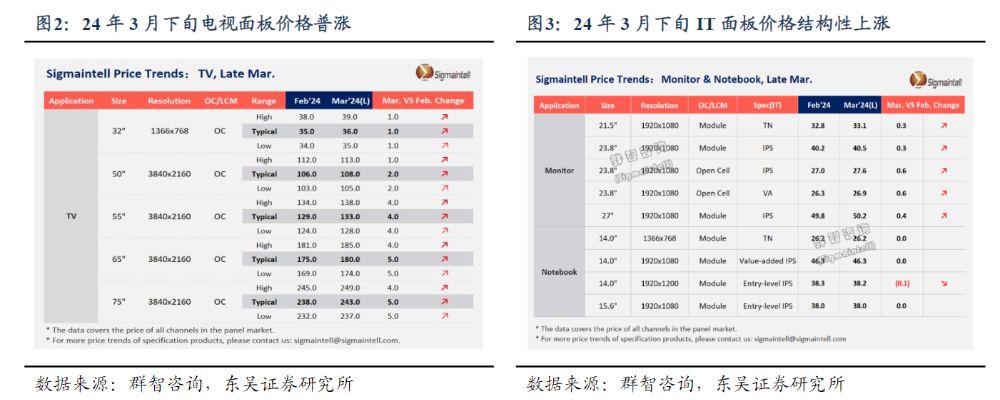 具体来看,各尺寸TV面板价格领涨。东吴证券表示,主要原因包括面板厂进行年度维护减少了短期供应;需求端方面,终端市场需求增加和体育营销活动预期等因素提升了面板需求。