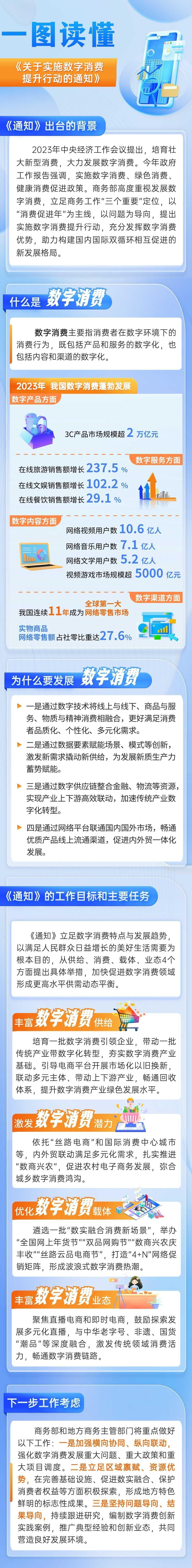 日前,商务部印发《关于实施数字消费提升行动的通知》(以下简称《通知》)。《通知》立足数字消费特点与发展趋势,以满足人民群众日益增长的美好生活需要为根本目的,从供给、消费、载体、业态4个方面提出具体举措,加快促进数字消费领域形成更高水平供需动态平衡。