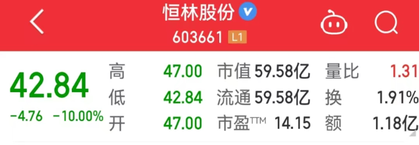 4月16日,恒林股份(603611.SH)低开低走,尾盘时出现跌停,收盘时报每股42.84元,总市值59.58亿元。