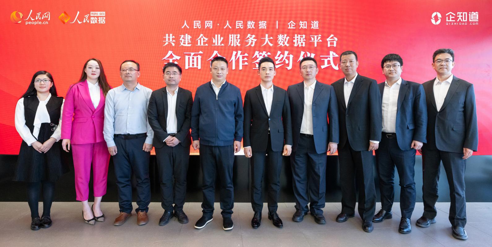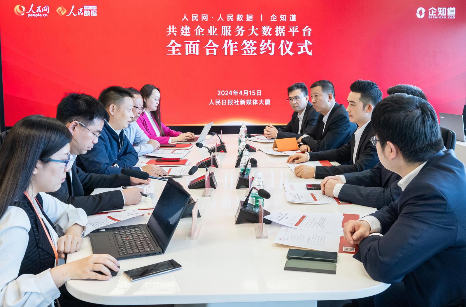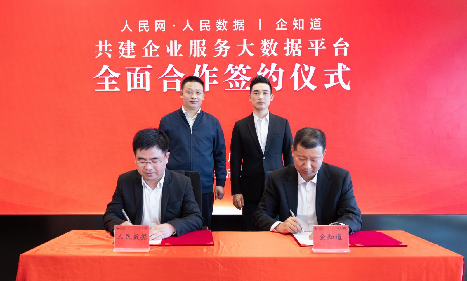 4月15日,人民网·人民数据与企知道在人民日报社新媒体大厦举行全面合作签约仪式。人民数据董事长、总经理郑光魁与企知道董事长、CEO夏华标出席并见证签约。