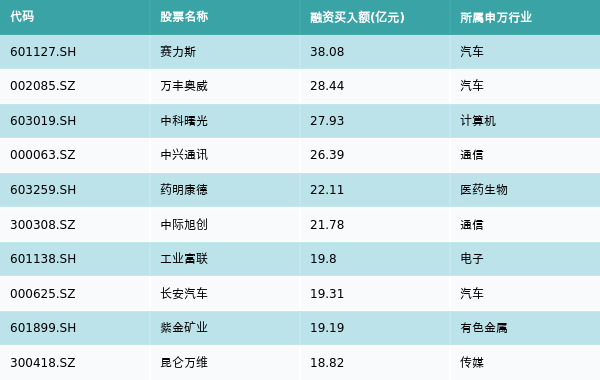 上周两市共有3348只个股有融资资金买入,共有41只个股买入金额超10亿元,其中赛力斯、万丰奥威、中科曙光排名前三,买入金额分别38.08亿元、28.44亿元、27.93亿元。融资买入额前10个股详情见下表: