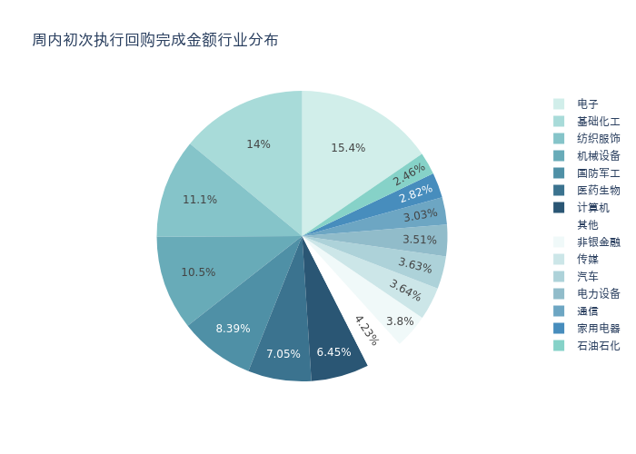 按照初次执行金额所在不同行业分布,金额最高的3个行业分别为:电子、基础化工、纺织服饰,详情见下图: