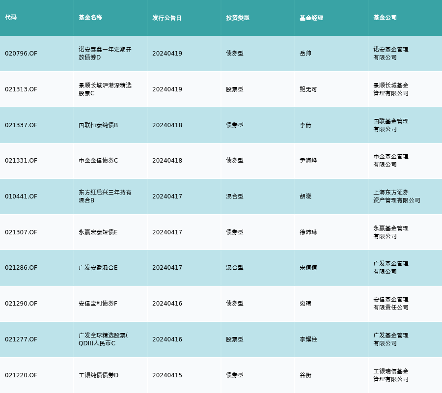 上周有10只新基金发行,分别为:诺安泰鑫一年定期开放债券D、景顺长城沪港深精选股票C、国联恒泰纯债B、中金金信债券C、东方红启兴三年持有混合B、永赢宏泰短债E、广发安盈混合E、安信宝利债券F、广发全球精选股票(QDII)人民币C、工银纯债债券D,详情见下表: