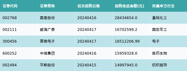 上周共有49条开始执行回购公告,其中执行金额最多的5条公告为: