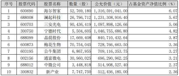 值得注意的是,兴全合润十大重仓股分别为海尔智家、澜起科技、三安光电、宁德时代、晶晨股份、梅花生物、公牛集团、通富微电、中微公司和新产业。