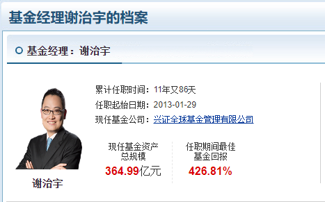 天天基金网显示,截至2024年4月22日,谢治宇现任基金资产总规模为364.99亿元,任职期间最佳基金回报为426.81%。