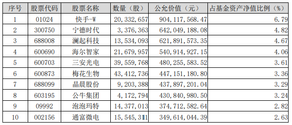 兴全合宜十大重仓股分别为快手-W、宁德时代、澜起科技、海尔智家、三安光电、梅花生物、晶晨股份、公牛集团、泡泡玛特和通富微电。