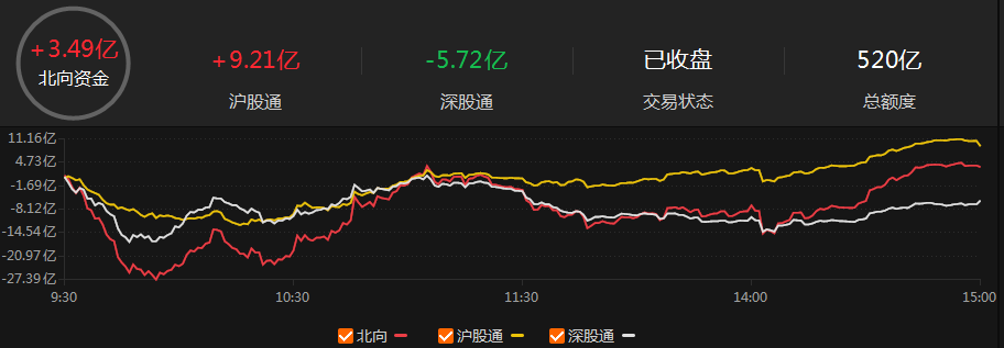 北向资金全天小幅净买入3.49亿元,其中沪股通净买入9.21亿元,深股通净卖出5.72亿元。