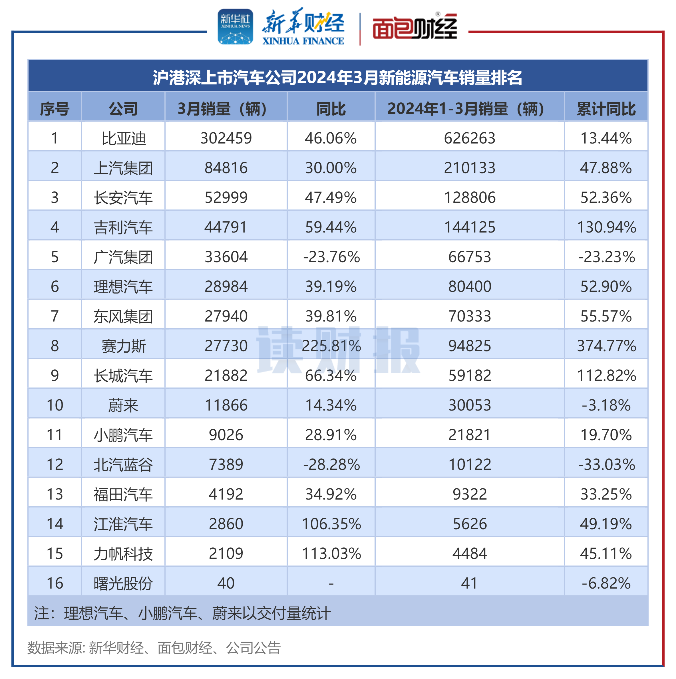 数据显示,比亚迪、上汽集团的3月新能源汽车销量均超过8万辆,其中比亚迪以30.25万辆位居行业第一。多数公司实现同比正增长,其中赛力斯、力帆科技、江淮汽车的同比增速超过100%;相比之下,北汽蓝谷、广汽集团同比下滑超过20%。