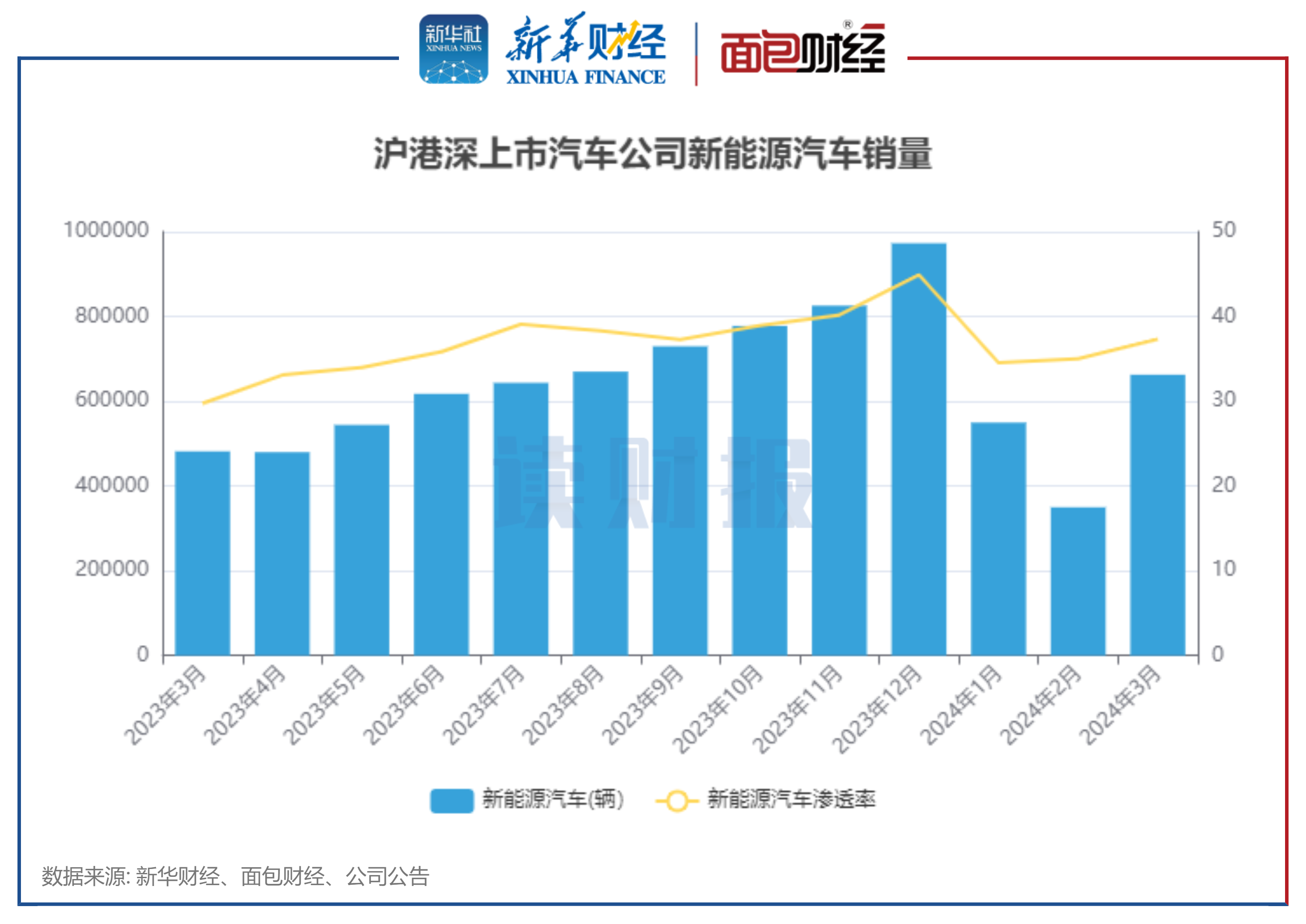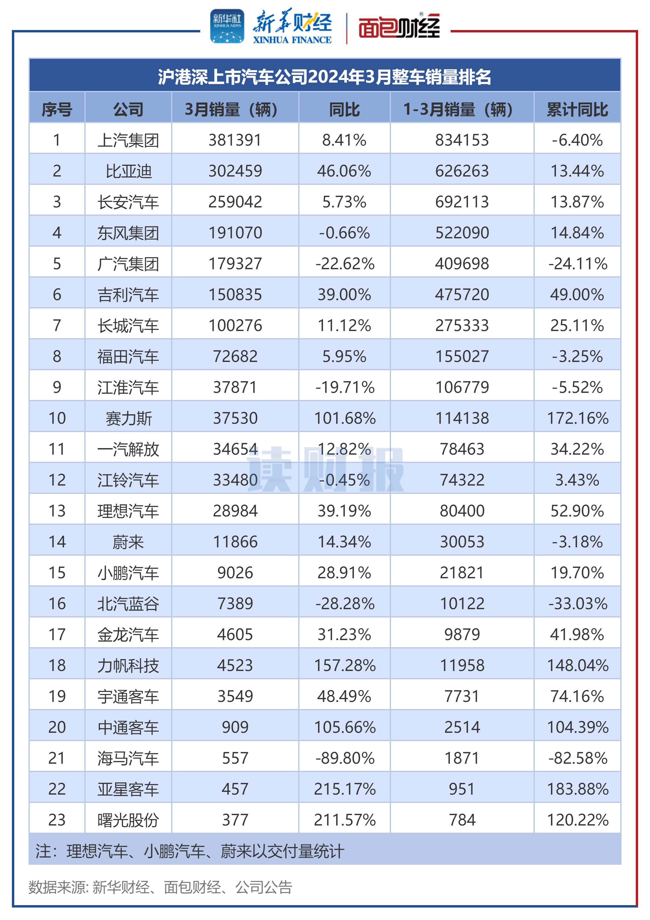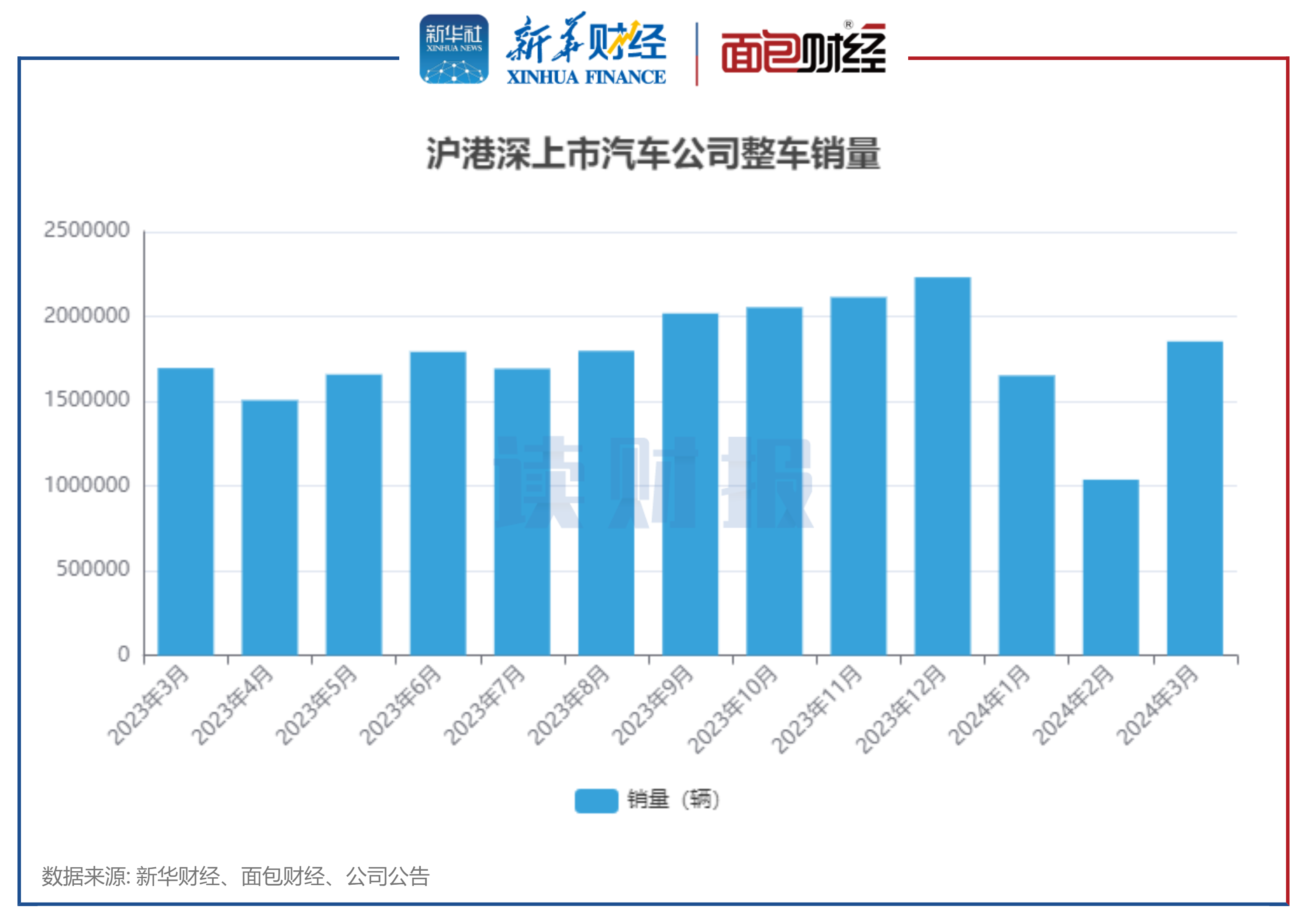 近期,汽车制造厂商陆续披露3月销售数据。新华财经和面包财经研究员以A、H股上市的主要汽车厂商披露的月度销售数据公告,分别统计其整车、新能源汽车的销量。