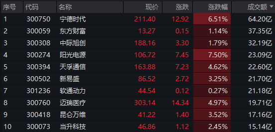 沪深两市半日成交额7386亿,较上个交易日同期放量1602亿。个股方面,宁德时代成交额64.20亿元居首,东方财富、中际旭创成交额均超30亿元。