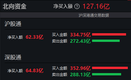 北向资金半日净买入127.16亿元。其中,沪股通净买入62.33亿元,深股通净买入64.83亿元。
