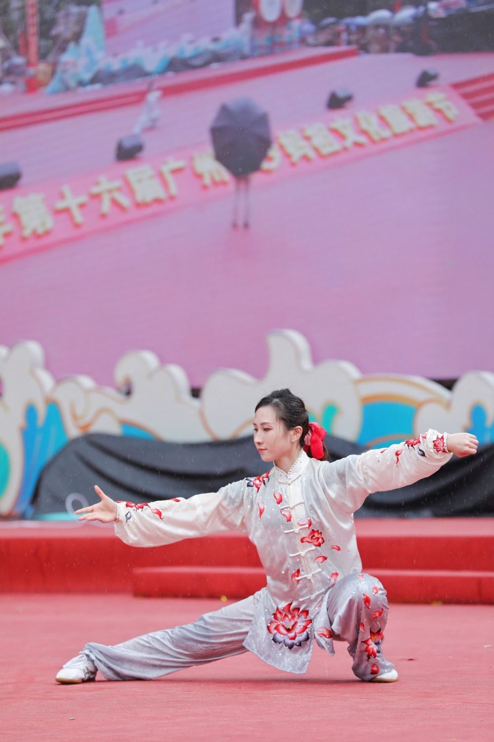 虽然当天活动阴雨不断,但是台上表演者和台下观众的热情都丝毫不减。南拳、太极拳、散打等各式武术表演逐一亮相,选手们以矫健的身姿、灵活的动作,将武术的力与美展现得淋漓尽致,引得观众们阵阵鼓掌喝彩。
