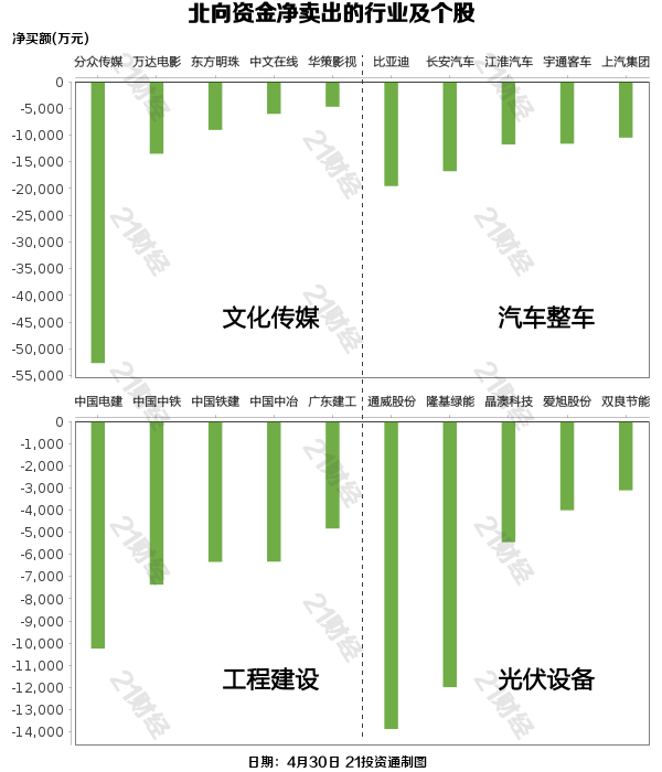 北向资金减持了80个行业,其中文化传媒最多,净卖出金额达11.38亿元,其次是汽车整车行业,净卖出9.61亿元。