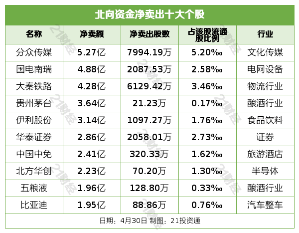 据21投资通智能监测,4月30日,北向资金净卖出86.17亿元,其中沪股通净卖出39.5亿元,深股通净卖出46.66亿元。